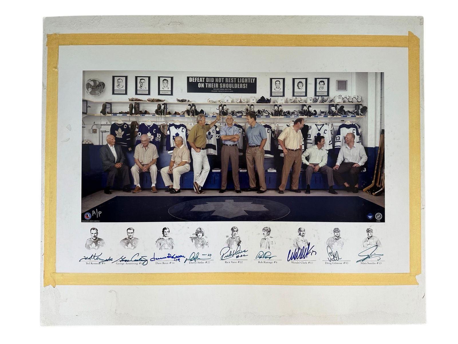 Toronto Maple Leafs "Captain's Row" autographed by 9 former captains. All 9 of these former Toronto Maple Leaf captains came together on June 16, 2005 for this photo. From left to right; Ted Kennedy, George Armstrong, Dave Keon, Darryl Sittler, Rick Vaive, Rob Ramage, Wendel Clark, Doug Gilmour and Mats Sundin. A fantastic piece of Leafs history. In excellent condition, but has been taped to a matboard and removed from previous frame. Included with a COA.