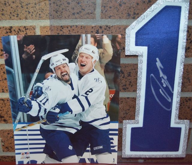 Toronto Maple Leafs "Owen Nolan"""" Signed Jersey Number with Flat 8x10 Photo. Wade Belak ( Decease) in photo."""