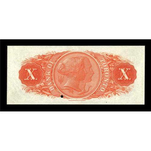<B>Toronto, ON- Bank of Toronto</B></I> $10 June 1, 1892 Ch. 715-22-26S Specimen<BR> This is the first specimen we have had on this bank. There is a single punch cancel through the printed signature. A pinhole is noticed near the bottom edge. <B>Choice Crisp Uncirculated</B></I>.<BR><BR><b>Shipping:</b> Coins & Currency (<a target="_blank" href="http://www.heritageauctions.com/common/shipping.php">view shipping information</a>)