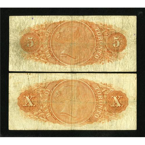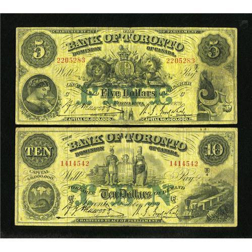 <B>Toronto, ON- Bank of Toronto</B></I> $5 October 1, 1929 Ch. 715-22-22.<BR><B>Toronto, ON- Bank of Toronto</B></I> $10 October 1, 1929 715-22-24.<BR>Both notes grade <B>Very Good+</B></I> and remain bright despite the circulation observed.<BR><BR><BR><b>Shipping:</b> Coins & Currency (<a target="_blank" href="http://www.heritageauctions.com/common/shipping.php">view shipping information</a>)