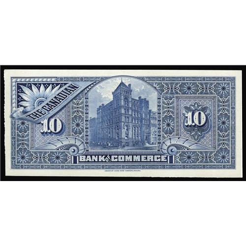 <B>Toronto, ON- Canadian Bank of Commerce</B></I> $10 (1888 - 1912) Charlton 75-14-16P thru 28P UNL Back Proof<BR>This blue colored proof was printed on card stock and it is uncancelled. The pencilled notation on the back is "received from Canada Oct. 31, 32 73161." The left-hand edge shows separation via a straight edge. <B>Gem Crisp Uncirculated.</B></I>