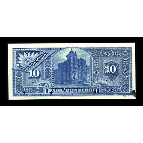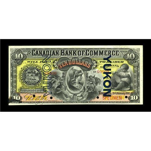 <B>Toronto, ON- Canadian Bank of Commerce</B></I> $10 Jan. 2, 1892 Ch. 75-14-18aS<BR>This Specimen example carries the "Yukon" overstamp, although the only Specimen listed in Charlton for this issuer carrying the Yukon overstamp is an 1898 $100, which carries a catalogue value of $6000. Our consignor paid $4620 (US) for this colorful example at the November, 1990 Christie's American Bank Note Company archives sale, where this piece was lot 243. With the market for better Canadian currency at record levels, it certainly is worth more today, likely considerably more. <B>About Uncirculated,</B></I> with 4 POC along with a small ink spot at the bottom left.<BR><BR><b>Shipping:</b> Coin/Currency (<a target="_blank" href="http://www.heritageauctions.com/common/shipping.php">view shipping information</a>)