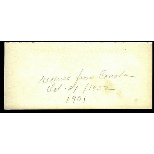 <B>Toronto, ON- Canadian Bank of Commerce</B></I> $10 Jan. 2, 1901 Charlton 75-14-20P Face Proof<BR>A stunning mixture of inks makes this a truly great proof to add to one's collection. It is mounted on card stock and is uncancelled. The top edge of the card stock looks like it was separated by a straight line. In pencil, the back reads, "received from Canada Oct. 31, 1932," plus "1901" for the date of the proof. <B>Choice Crisp Uncirculated.</B></I>