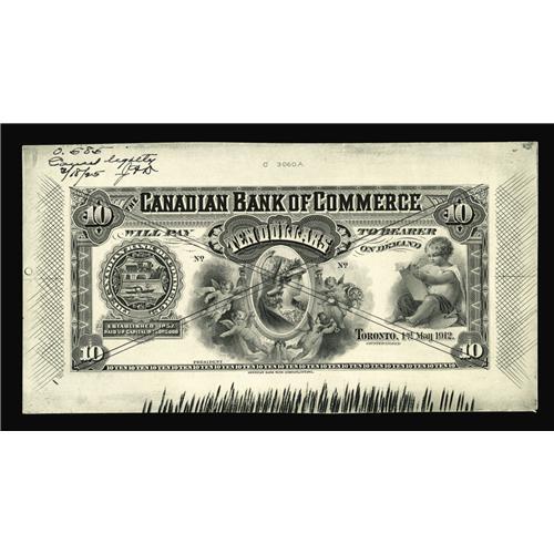 <B>Toronto, ON- Canadian Bank of Commerce</B></I> $10 May 1, 1912 Charlton 75-14-26P Face Proof<BR>Cross-hatch lines and extra ink are found in the margins of this proof printed on card stock. Ink smudging is noticed on this ABNCo, Ottawa proof. It has also been pen cancelled with diagonal lines. This fact was penned by our now familar JPD on 3/18/25 in the upper left-hand corner. The face and back also exhibit a little more writing. <B>Crisp Uncirculated.</B></I>