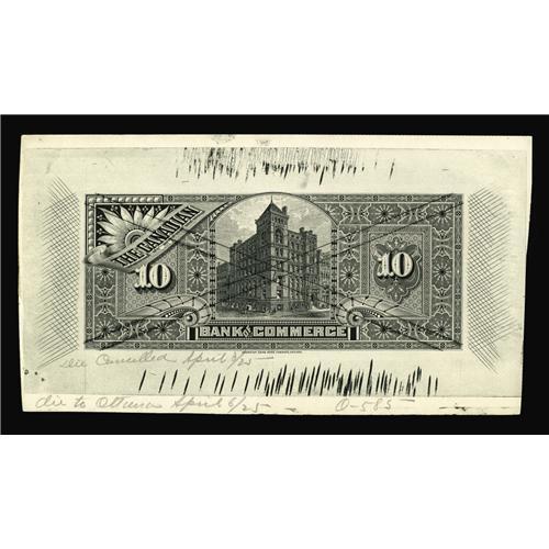 <B>Toronto, ON- Canadian Bank of Commerce</B></I> $10 (1888 - 1912) Charlton 75-14-16P thru 28P Back Proof<BR>This black and white proof was printed on card stock. Ink smudging is found on this proof plus extraneous ink and cross-hatch lines. It also has been pen cancelled. There are notations on the face and back and we learn from this that this die was also cancelled on April 3, 1925. <B>Crisp Uncirculated.</B></I>