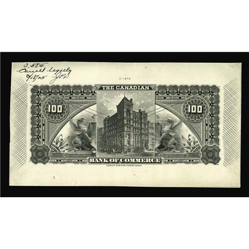 <B>Toronto, ON- Canadian Bank of Commerce</B></I> $100 (1888 - 1912) Charlton 75-14-56P thru 64P Back Proof<BR>This proof was printed on card stock. Cross hatch lines and some ink smudging is noticed along with a pen cancellation. Notations are found on the face and back, and we learn from the writing of JPD that this die was also cancelled on April 18, 1925. <B>Crisp Uncirculated.</B></I>