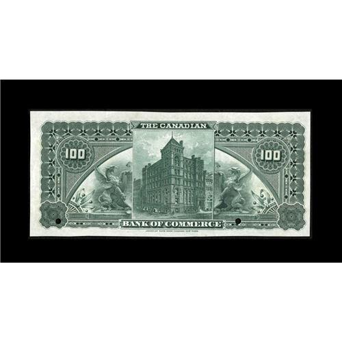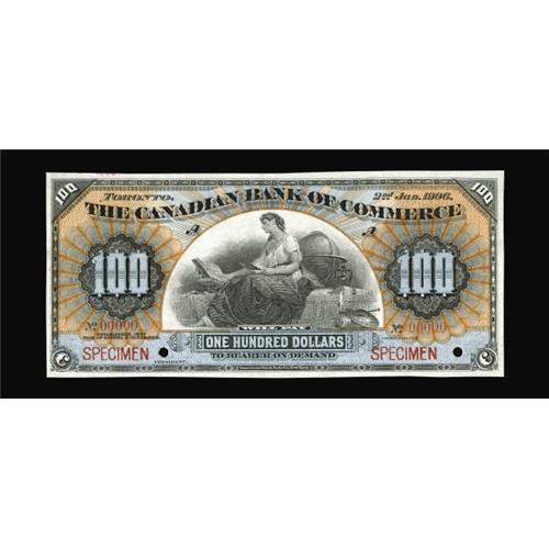 <B>Toronto, ON- Canadian Bank of Commerce</B></I> $100 Jan. 2, 1906 Ch. 75-14-60S Specimen<BR>Blue, orange, and black inks are found on this specimen that is punch cancelled. There are no known issued notes of this design. <B>Choice About Uncirculated,</B></I> PC.<BR><I>From The Halton Lake Collection</B></I>
