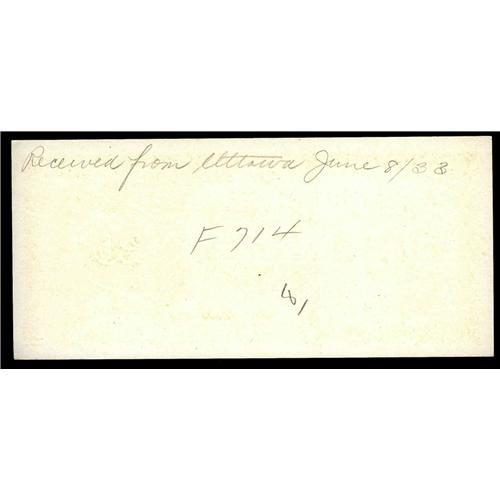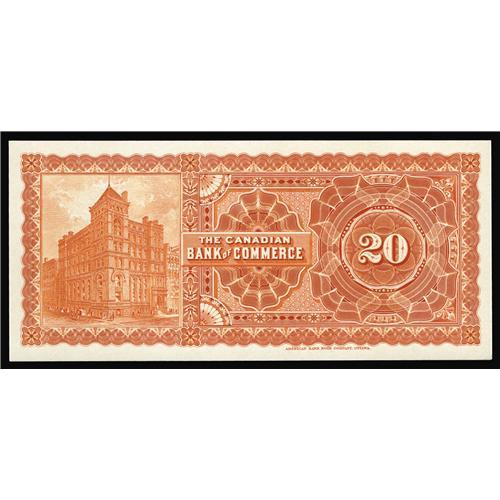 <B>Toronto, ON- Canadian Bank of Commerce</B></I> $20 (1888 - 1912) Charlton 75-14-30P thru 42P UNL Back Proof<BR>This orange-brown colored proof was printed on card stock. It has not been cancelled and the back carries the inscription "received from Ottawa June 8, 33" plus "F714" and "8." <B>Gem Crisp Uncirculated.</B></I>
