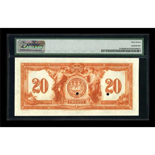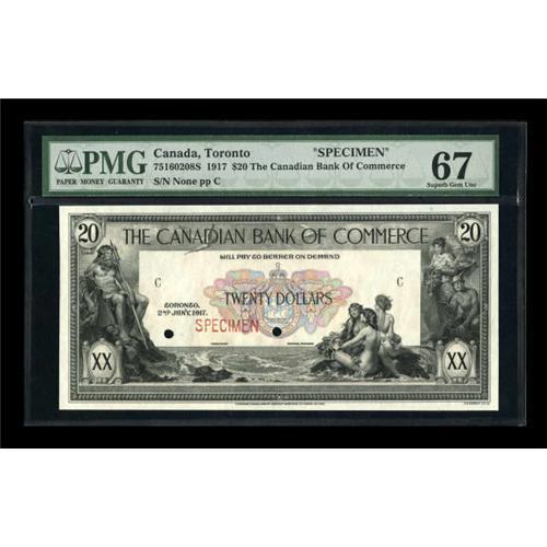 <B>Toronto, ON- Canadian Bank of Commerce</B></I> $20 Jan. 2, 1917 Ch. 75-16-02-08S<BR> The margins on this colorful specimen are quite large and very even. The note is stamped 'Specimen' and punch cancelled twice. <B>PMG Superb Gem Unc 67</B></I>.<BR><BR><b>Shipping:</b> Coins & Currency (<a target="_blank" href="http://www.heritageauctions.com/common/shipping.php">view shipping information</a>)