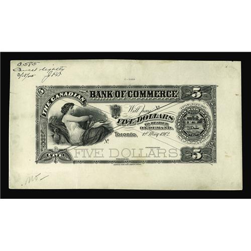 <B>Toronto, ON- Canadian Bank of Commerce</B></I> $5 May 1, 1912 Charlton 75-14-12P Face Proof<BR>Ink smudging and a corner bend are found on this black and white ABNCo, Ottawa proof that was printed on card stock. It has been pen cancelled with diagonal lines. This fact was penned by employee JPD on 3/10/25 in the upper left-hand corner. The face and back also exhibit a little more writing. <B>Crisp Uncirculated.</B></I>