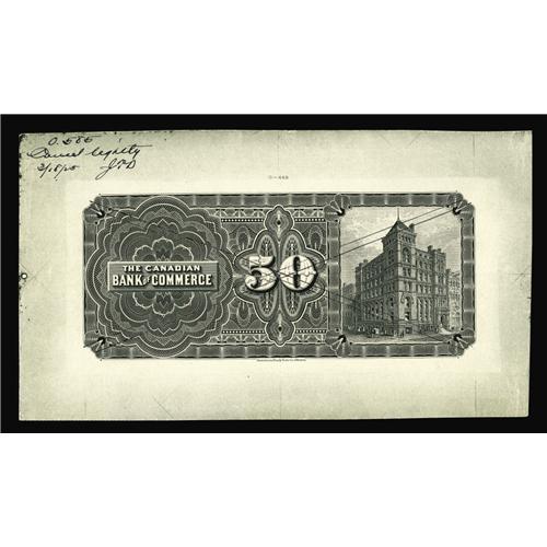 <B>Toronto, ON- Canadian Bank of Commerce</B></I> $50 (1893 - 1912) Charlton 75-14-44P thru 54P Back Proof<BR>This proof was printed on card stock. A light dusting of ink takes up approximately three-fourths of an inch of the four margins on this proof. It also has been pen cancelled. There are notations on the face and back and we learn from this writing of JPD that this die was cancelled on April 18, 1925. <B>Crisp Uncirculated.</B></I>