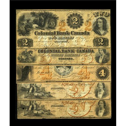 <B>Toronto, ON- Colonial Bank of Canada</B></I> $2; $3; $4; $5 (2) 1859 VF; VF; XF, pinholes; Fine; Fine, PC Ch. 130-10-02-04; 06; 08; 10 <BR>Overall a nice grouping from this bank that operated for six months.<BR><I>From The Halton Lake Collection</B></I>