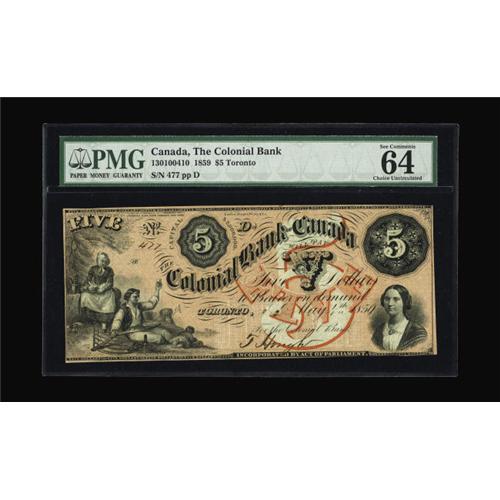 <B>Toronto, ON- Colonial Bank of Canada</B></I> $5 May 4, 1859 Ch. 130-10-04-10<BR>A well preserved $5 that exhibits Exceptional Paper Quality as stated on its holder. <B>PMG Choice Uncirculated 64 EPQ.</B></I>