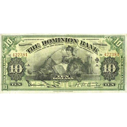 <B>Toronto, ON- Dominion Bank</B></I> $10 Jan. 2, 1925 Ch. 220-18-10<BR>Originality is a trademark of this $10. <B>Very Fine.</B></I><BR><I>From The Halton Lake Collection</B></I>