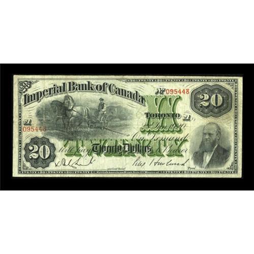 <B>Toronto, ON- Imperial Bank of Canada</B></I> $20 Jan. 2, 1920 Ch. # 375-16-18<BR> This is a considerably scarcer denomination in this issue. <B>Fine.</B></I><BR><I>From The Thomas M. Flynn Collection</B></I><BR><BR><b>Shipping:</b> Coins & Currency (<a target="_blank" href="http://www.heritageauctions.com/common/shipping.php">view shipping information</a>)