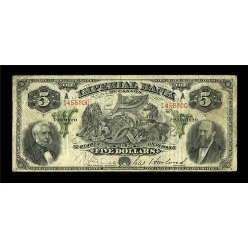<B>Toronto, ON- Imperial Bank of Canada</B></I> $5 Jan. 2, 1920 Ch. # 375-16-06<BR> A nice evenly circulated <B>Fine</B></I> example. <BR><I>From The Thomas M. Flynn Collection</B></I><BR><BR><b>Shipping:</b> Coins & Currency (<a target="_blank" href="http://www.heritageauctions.com/common/shipping.php">view shipping information</a>)