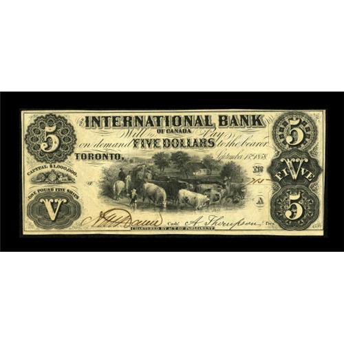 <B>Toronto, ON- International Bank</B></I> $5 Sept. 15, 1858 Ch. 380-10-02-08<BR> A lovely example of this none too common note, which is priced in Charlton only through the Extremely Fine grade. This one is nicer. <B>About Uncirculated.</B></I><BR><BR><b>Shipping:</b> Coins & Currency (<a target="_blank" href="http://www.heritageauctions.com/common/shipping.php">view shipping information</a>)