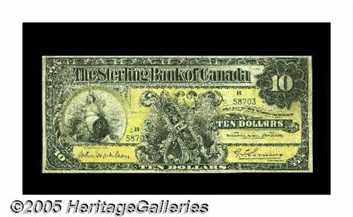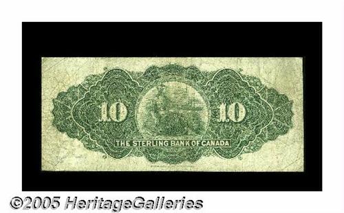 <B>Toronto, ON- Sterling Bank of Canada</B></I> $10 Apr. 25 1906 Charlton 700-10-04<BR>This $10 was able to avoid pinholes and edge tears. <B>Fine.</B></I>