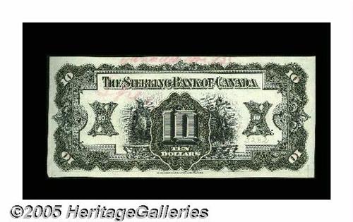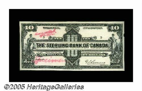 <B>Toronto, ON- Sterling Bank of Canada</B></I> $10 Jan. 3, 1921 Charlton Unlisted (700-14-02P) Face and Back Proofs<BR>These black-and-white proofs are unlisted in the Charleton reference. Each proof has "Specimen" and "Cancelled" penned in red ink. The face proof has a small notch missing from the right-hand edge. Also, both uniface proofs reveal evidence of once having been mounted, and they grade <B>Crisp Uncirculated.</B></I><BR>