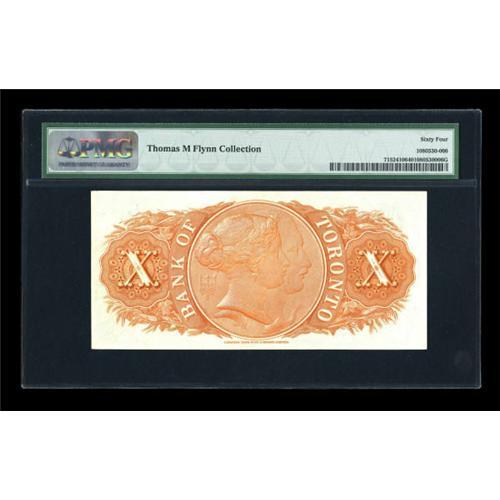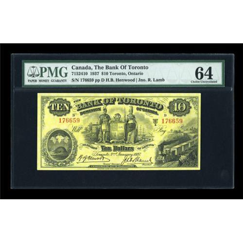 <B>Toronto, ON- The Bank of Toronto</B></I> $10 Jan. 2, 1937 Ch. # 715-24-10<BR> PMG has only graded three examples of this number to date, a VF 25, a VF 35, and this <B>Choice Uncirculated 64.</B></I> While not rare, these are truly elusive notes in the uncirculated grade. <BR><I>From The Thomas M. Flynn Collection</B></I><BR><BR><b>Shipping:</b> Coins & Currency (<a target="_blank" href="http://www.heritageauctions.com/common/shipping.php">view shipping information</a>)