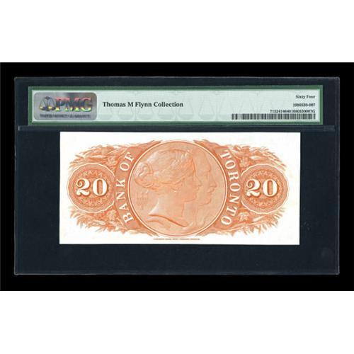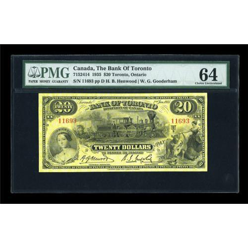 <B>Toronto, ON- The Bank of Toronto</B></I> $20 Jan. 2, 1935 Ch. # 715-24-14<BR> This was the only small $20 issued by this bank, and, while common in circulated grades, is very scarce in this state of preservation. PMG has graded four examples to date, with the highest (save for this piece) an Extremely Fine 45. Expect some spirited bidding for this bright and well margined <B>Choice Uncirculated 64</B></I> specimen. <BR><I>From The Thomas M. Flynn Collection</B></I><BR><BR><b>Shipping:</b> Coins & Currency (<a target="_blank" href="http://www.heritageauctions.com/common/shipping.php">view shipping information</a>)