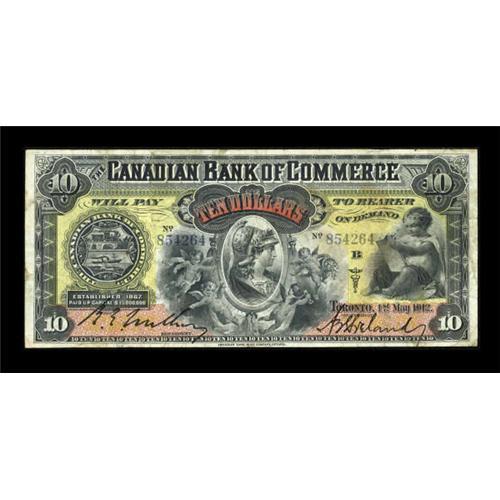 <B>Toronto, ON- The Canadian Bank of Commerce</B></I> $10 May 1, 1912 Ch. # 75-14-28<BR> Similar to the 1907 $10 offered above, but with a 1912 issue date and a changed capitalization amount at left, which now reads $15,000,000 from the earlier $10,000,000. <B>Fine-Very Fine.</B></I><BR><I>From The Thomas M. Flynn Collection</B></I><BR><BR><b>Shipping:</b> Coins & Currency (<a target="_blank" href="http://www.heritageauctions.com/common/shipping.php">view shipping information</a>)