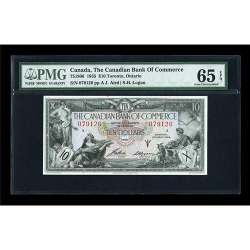 <B>Toronto, ON- The Canadian Bank of Commerce</B></I> $10 Jan. 2, 1935 Ch. # 75-18-06<BR> A beautiful 1935 example with broad margins and great eye appeal. PMG has graded this <B>Gem Uncirculated 65 EPQ, </B></I> a designation it certainly deserves. <BR><I>From The Thomas M. Flynn Collection</B></I><BR><BR><b>Shipping:</b> Coins & Currency (<a target="_blank" href="http://www.heritageauctions.com/common/shipping.php">view shipping information</a>)