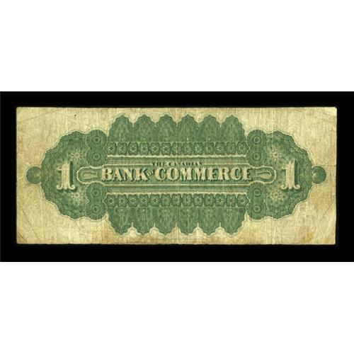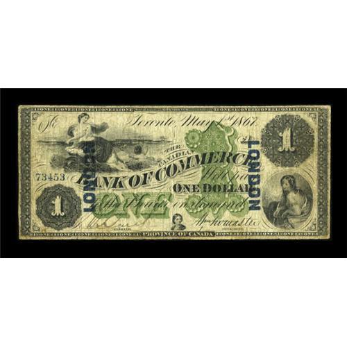 <B>Toronto, ON- The Canadian Bank of Commerce</B></I> $1 May 1, 1867 Ch. # 75-10-02a<BR> An extremely rare note from this bank's first issue dated May 1, 1867. It bears the distinctive "London" overprint in blue on both sides of the front. This note is only priced in grades through Very Fine in the Charlton reference, an indication of how truly scarce these early Canadian Bank of Commerce issues are. Nice <B>Fine+,</B></I> a high grade indeed for this rarity. <BR><I>From The Thomas M. Flynn Collection</B></I><BR><BR><b>Shipping:</b> Coins & Currency (<a target="_blank" href="http://www.heritageauctions.com/common/shipping.php">view shipping information</a>)