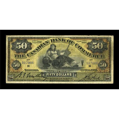 <B>Toronto, ON- The Canadian Bank of Commerce</B></I> $50 May 1, 1912 Ch. # 75-14-54<BR> Another truly rare item from the Flynn collection, with this note not even priced above the Very Good grade in the Charlton reference. Nice <B>Fine,</B></I> a great high denomination example worthy of a very strong bid. <BR><I>From The Thomas M. Flynn Collection</B></I><BR><BR><b>Shipping:</b> Coins & Currency (<a target="_blank" href="http://www.heritageauctions.com/common/shipping.php">view shipping information</a>)