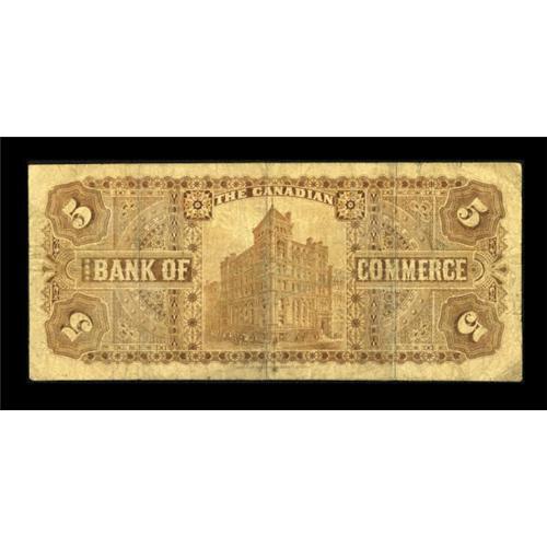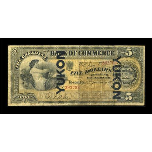 <B>Toronto, ON- The Canadian Bank of Commerce</B></I> $5 Yukon Overprint Jan. 2, 1892 Ch. # 74-14-04c<BR> Notes from this bank bearing the Yukon overprint are among the greatest rarities in Canadian chartered bank currency, as well as carrying a romance that comes with being an integral part of Canadian history as well. The notes carrying the Yukon overprint were used as currency during the Gold Rush of 1898, when the Yukon served as the jumping off and supply point for the thousands of miners heading to the newly discovered gold fields of Alaska. Only a few examples survive, with only a handful not victimized by years of hard circulation. Fortunately for collectors, the Flynn collection contains the nicest Yukon overprint note we've seen in many years, grading <B>Fine,</B></I> with good color and body for the grade. Any estimate here is merely a guess, as these notes are so infrequently offered, but we would not be at all surprised to see a realization in the vicinity of...<BR><I>From The Thomas M. Flynn Collection</B></I><BR><BR><b>Shipping:</b> Coins & Currency (<a target="_blank" href="http://www.heritageauctions.com/common/shipping.php">view shipping information</a>)