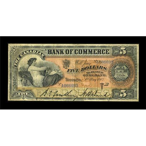 <B>Toronto, ON- The Canadian Bank of Commerce</B></I> $5 May 1, 1912 Ch. # 75-14-14<BR> A nice evenly circulated <B>Fine-Very Fine</B></I> example. <BR><I>From The Thomas M. Flynn Collection</B></I><BR><BR><b>Shipping:</b> Coins & Currency (<a target="_blank" href="http://www.heritageauctions.com/common/shipping.php">view shipping information</a>)