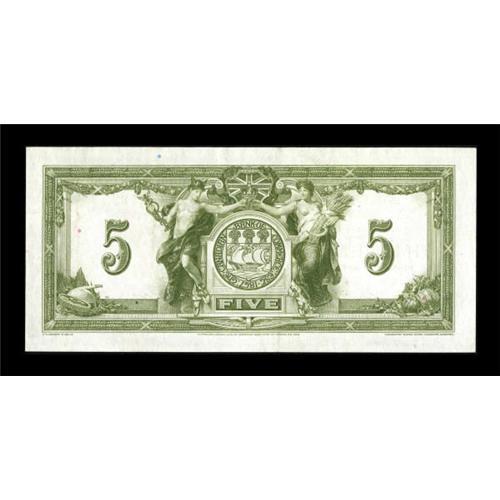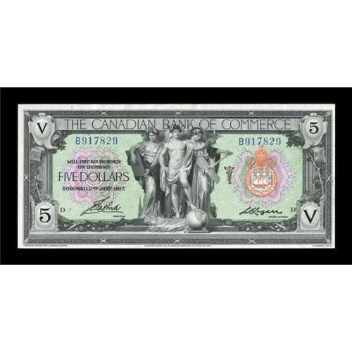 <B>Toronto, ON- The Canadian Bank of Commerce</B></I> $5 Jan. 2, 1917 Ch. # 75-16-04-06a<BR> The allegorical 1917 issue is the first issue from this bank which is readily available in well circulated condition. High grade examples, however, are difficult to find in the lower denominations (save for the $5 with the white background, which is very rare in all grades) and just plain scarce in the higher value notes. This $5 note bears the green face tint and small Logan signature. <B>About Uncirculated.</B></I><BR><I>From The Thomas M. Flynn Collection</B></I><BR><BR><b>Shipping:</b> Coins & Currency (<a target="_blank" href="http://www.heritageauctions.com/common/shipping.php">view shipping information</a>)