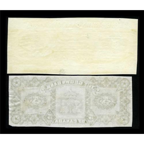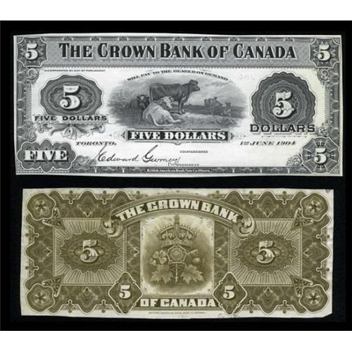<B>Toronto, ON- The Crown Bank of Canada</B></I> $5 June 1, 1904 Ch. # 215-10-02P Face and Back Proofs<BR> The face proof is printed in black ink and the back is brown. Different colors are known for these. Both proofs grade <B>Crisp Uncirculated </B></I>with the face having a pencil notation and the back exhibiting a clipped corner.<BR><BR><b>Shipping:</b> Coins & Currency (<a target="_blank" href="http://www.heritageauctions.com/common/shipping.php">view shipping information</a>)