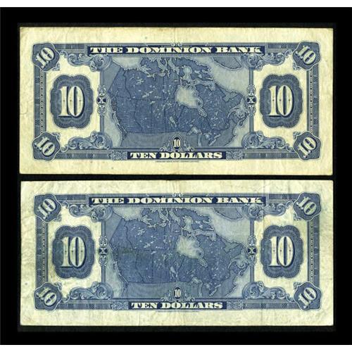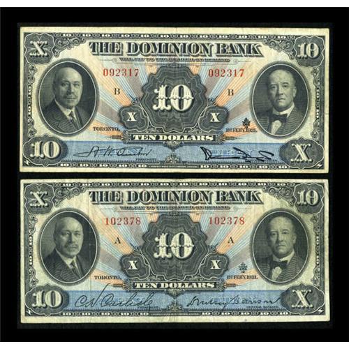 <B>Toronto, ON- The Dominion Bank</B></I> $10 (2) Feb. 1, 1931 Ch. # 220-24-06, 220-24-08<BR> One each of the signature combinations issued in this denomination, with the Austin-Bogert note grading <B>Fine-Very Fine</B></I> with a small edge split and the Austin-Dawson note <B>Fine-Very Fine</B></I> as well. <BR><I>From The Thomas M. Flynn Collection</B></I><BR><BR><b>Shipping:</b> Coins & Currency (<a target="_blank" href="http://www.heritageauctions.com/common/shipping.php">view shipping information</a>)
