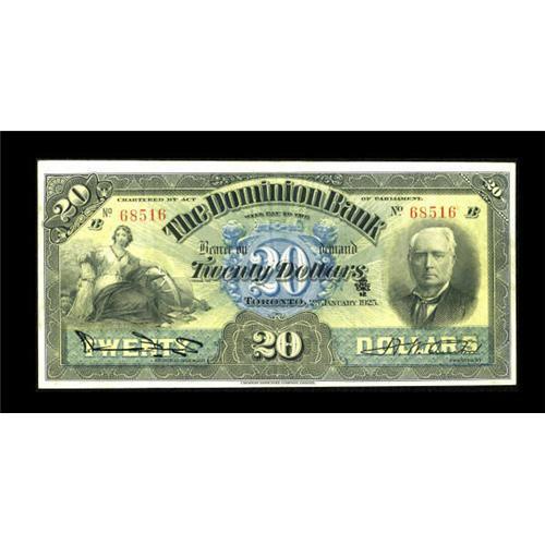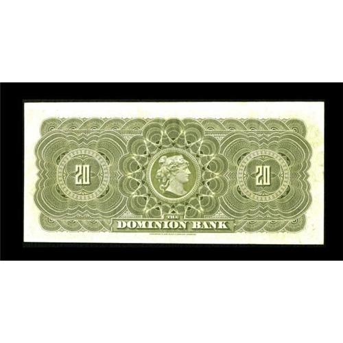 <B>Toronto, ON- The Dominion Bank </B></I>$20 Jan. 2, 1925 Ch. # 220-20-08<BR> This multi-colored note was the last of its design. Bright <B>Very Fine+.</B></I><BR><I>From The Thomas M. Flynn Collection</B></I><BR><BR><b>Shipping:</b> Coins & Currency (<a target="_blank" href="http://www.heritageauctions.com/common/shipping.php">view shipping information</a>)