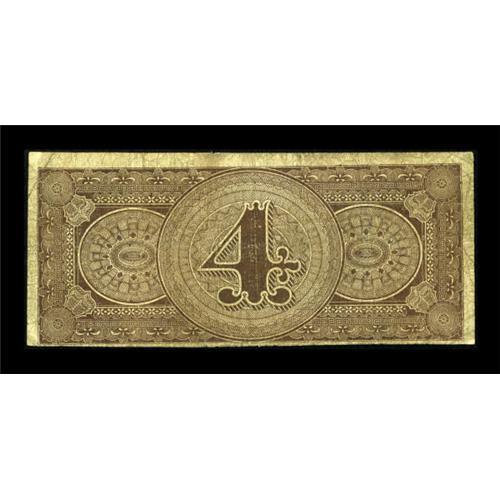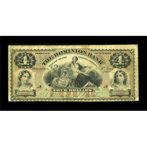 <B>Toronto, ON- The Dominion Bank</B></I> $4 Jan. 1, 1876 Ch. # 220-12-02 Ch. # 220-12-02<BR> This bank was established in 1869 and grew to become one of the largest in Canada. From its inception until 1955, it never acquired or merged with any other bank, preferring slow but steady internal growth. Its record of paying dividends in good years and bad was almost unparalleled, and its steady management was the envy of other financial institutions. This collection contains sixteen notes from this bank, including this rarity. <B>Fine, </B></I>with the distinctive brown reverse design found only on this denomination.<BR><I>From The Thomas M. Flynn Collection</B></I><BR><BR><b>Shipping:</b> Coins & Currency (<a target="_blank" href="http://www.heritageauctions.com/common/shipping.php">view shipping information</a>)