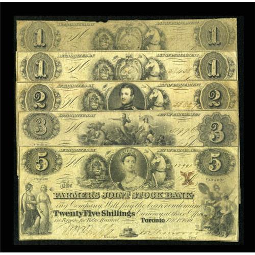 <B>Toronto, UC- The Farmer's Joint Stock Banking Company</B></I> $1, $5, $1, $2, $3 Feb. 1, 1849 Ch. # 280-12-02, 280-12-06, 280-14-04-02, 280-14-04-04, 280-14-04-06<BR> Five notes from the bank's 1849 issue, the first two lacking the red protector, the last three with the protector. Grades are <B>Good, Very Good, Fine, Fine, </B></I>and <B>Very Good</B></I> respectively. <BR><I>From The Thomas M. Flynn Collection</B></I><BR><BR><b>Shipping:</b> Coins & Currency (<a target="_blank" href="http://www.heritageauctions.com/common/shipping.php">view shipping information</a>)