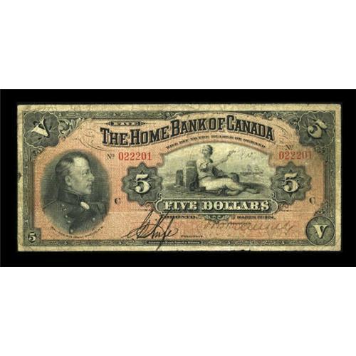 Toronto, ON- The Home Bank of Canada $5 March 1,