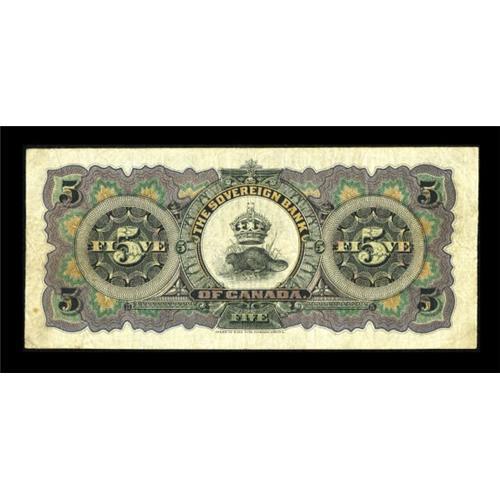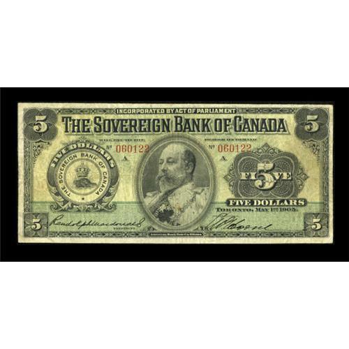 <B>Toronto, ON- The Sovereign Bank of Canada</B></I> $5 May 1, 1905 Ch. # 685-10-04<BR> Launched in 1901 by Sir Herbert Holt in cooperation with noted financier J.P. Morgan, The Sovereign Bank of Canada had, in the words of the Charlton reference, "a brief but spectacular existence." Starting from nothing, the bank grew rapidly, opening over eighty branches in just over six years. Unfortunately, rapid growth meant bad credit decisions, and, with confidence shattered by the Panic of 1907, the institution foundered. By 1908 it was history, although all depositors and creditors were paid in full and its notes were redeemed at just over par. All notes from here can be considered rare. Pleasing <B>Fine, </B></I> with an unusual and seldom used portrait of King Edward VII as the central vignette.<BR><I>From The Thomas M. Flynn Collection</B></I><BR><BR><b>Shipping:</b> Coins & Currency (<a target="_blank" href="http://www.heritageauctions.com/common/shipping.php">view shipping information</a>)