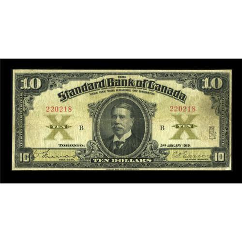 <B>Toronto, ON- The Standard Bank of Canada</B></I> $10 Jan. 2, 1919 Ch. # 695-18-20<BR> An evenly circulated <B>Fine</B></I> example. <BR><I>From The Thomas M. Flynn Collection</B></I><BR><BR><b>Shipping:</b> Coins & Currency (<a target="_blank" href="http://www.heritageauctions.com/common/shipping.php">view shipping information</a>)