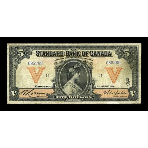 <B>Toronto, ON- The Standard Bank of Canada</B></I> $5 Jan. 2, 1914 Ch. # 695-18-02<BR> A tougher note with a population of only around twenty pieces in all grades and for both signature combinations. <B>Fine.</B></I><BR><I>From The Thomas M. Flynn Collection</B></I><BR><BR><b>Shipping:</b> Coins & Currency (<a target="_blank" href="http://www.heritageauctions.com/common/shipping.php">view shipping information</a>)
