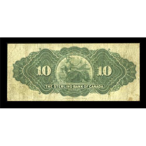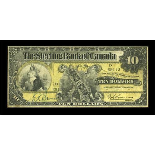 <B>Toronto, ON- The Sterling Bank of Canada</B></I> $10 April 25, 1906 Ch. # 700-10-04<BR> Almost, but not quite as scarce as the $5 offered above. <B>Fine.</B></I><BR><I>From The Thomas M. Flynn Collection</B></I><BR><BR><b>Shipping:</b> Coins & Currency (<a target="_blank" href="http://www.heritageauctions.com/common/shipping.php">view shipping information</a>)