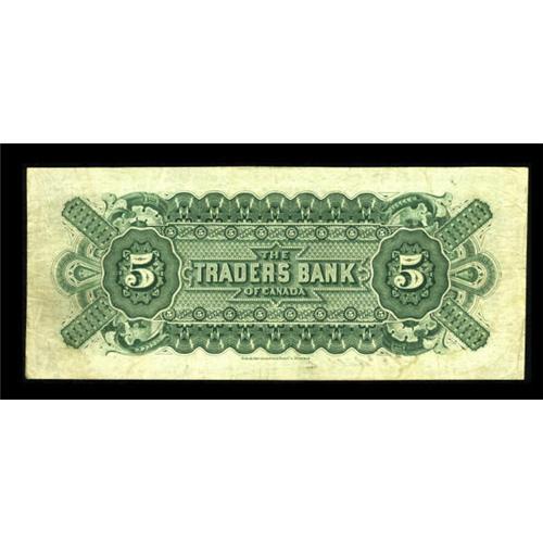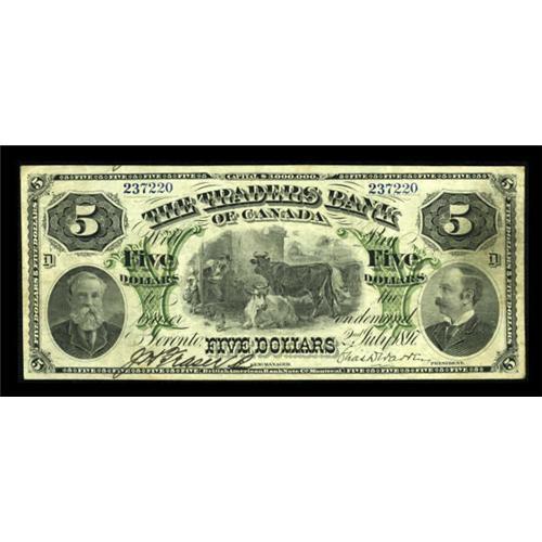 <B>Toronto, ON- The Traders Bank</B></I> $5 July 2, 1897 Ch. # 720-14-02c<BR> This well regarded institution prospered between its founding in 1885 and its acquisition by the Royal Bank of Canada in 1912. All notes from this bank are quite scarce, especially those in this state of preservation. <B>Very Fine.</B></I><BR><I>From The Thomas M. Flynn Collection</B></I><BR><BR><b>Shipping:</b> Coins & Currency (<a target="_blank" href="http://www.heritageauctions.com/common/shipping.php">view shipping information</a>)