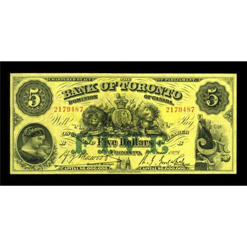 <B>Toronto, ONT- The Bank of Toronto</B></I> $5 Oct. 1, 1929 Ch. 715-22-22<BR> A bright and fresh example with the distinctive yellow tint used by this bank on the face and a vivid orange reverse. <B>Very Fine.</B></I><BR><I>From The John Ameen Collection</B></I><BR><BR><b>Shipping:</b> Coins & Currency (<a target="_blank" href="http://www.heritageauctions.com/common/shipping.php">view shipping information</a>)