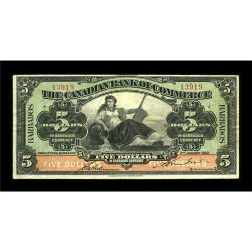 <B>Toronto, ONT- The Canadian Bank of Commerce</B></I> $5 Jan. 2, 1922 Ch. 75-20-04 Barbados Issue<BR> A second example which is very close in grade to its sibling. Nice <B>Fine++.</B></I><BR><BR><b>Shipping:</b> Coins & Currency (<a target="_blank" href="http://www.heritageauctions.com/common/shipping.php">view shipping information</a>)