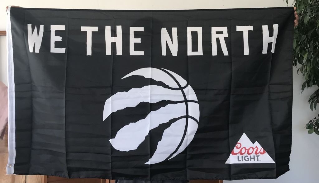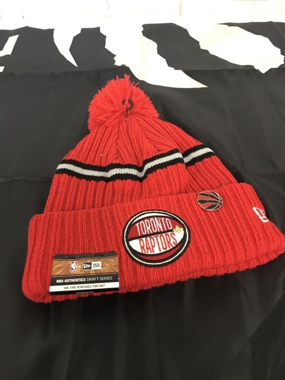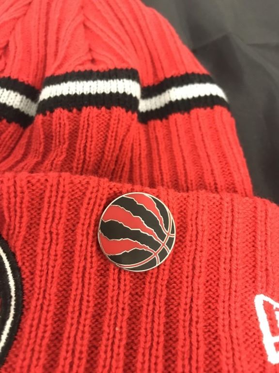 Toronto Raptors Tuque, Pin & Flag - the tuque is red and has a Raptors pin attached to it. The flag says ‘We The North’ & measures 60x35.5 inches.