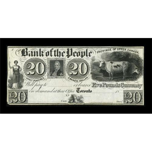 <B>Toronto, UC- The Bank of the People</B></I> $20 Ch. 570-12-20P Proof<BR> Last appearing in our 2007 Long Beach Signature auction where the description read, "A miracle of survival, as this may well be the only example of this denomination known to exist. The Charlton reference lists no Proofs and annotates regular issues with the words "Surviving Examples Not Confirmed." This piece is one of the highlights of the Florida Proof grouping, and will certainly become one of the highlights of the collection it now enters. <B>Uncirculated, </B></I>with a tiny nibble off the bottom left corner tip."<BR><BR><b>Shipping:</b> Coins & Currency (<a target="_blank" href="http://www.heritageauctions.com/common/shipping.php">view shipping information</a>)