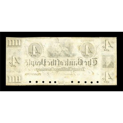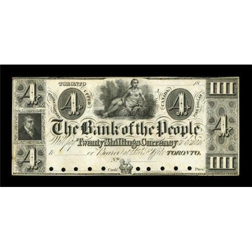 <B>Toronto, UC- The Bank of the People</B></I> $4 Ch. 570-12-08P Proof<BR> A lovely Proof which is perhaps even more desirable than the $3 Proof offered above. Again, the Charlton reference lists no Proofs extant in this denomination, and indicates that surviving issued example exist in "Institutional Collections Only." The example illustrated in the current edition has several pieces missing. This specimen does not. <B>Uncirculated, with 10 POC, </B></I>a true wonder note offered here to the numismatic community for the first time. 570-12-08<BR><BR><b>Shipping:</b> Coins & Currency (<a target="_blank" href="http://www.heritageauctions.com/common/shipping.php">view shipping information</a>)