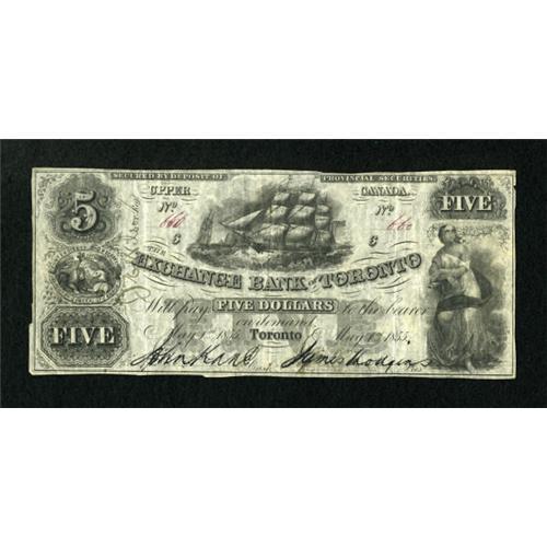<B>Toronto, UC- The Exchange Bank of Toronto</B></I> $5 May 1. 1855 Ch. # 255-10-06R Remainder<BR> The signatures and serial numbers have been added to this lightly handled remainder. <B>Very Fine</B></I>.<BR><BR><b>Shipping:</b> Coins & Currency (<a target="_blank" href="http://www.heritageauctions.com/common/shipping.php">view shipping information</a>)