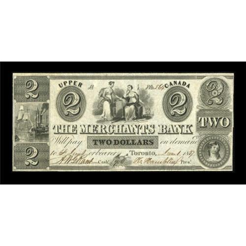 <B>Toronto, UC- The Merchants Bank</B></I> $2 June 1, 1837 Ch. # 450-10-06<BR> A second signed and issued example, with this also a high grade piece. <B>About Uncirculated.</B></I><BR><I>From The Thomas M. Flynn Collection</B></I><BR><BR><b>Shipping:</b> Coins & Currency (<a target="_blank" href="http://www.heritageauctions.com/common/shipping.php">view shipping information</a>)